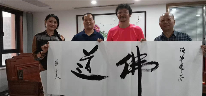 和蔼可亲,全无明星架子,这是安老师留给大家的第一印象,活动结束后,安老师与员工们一一握手致意,并合影留念。临走亲笔题写书法作品“佛道”留作纪念,安老师及其同行友人对缘亿公司团队给予了充分的肯定,表示在合适的时间还会来看望大家。在此,我们对安老师及其友人由衷的表示感谢,感谢他们友情助力我们的国庆活动,让我们有幸与明星一起祝福伟大的祖国。祝福安老师在以后的日子里星途璀璨,一帆风顺,再出佳作!